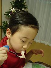 ↓ チキンを見て 嬉しさの余り 笑う幸希。ホントに美味し〜〜いトコロをちょこっとだけ食べる渋いヤツ