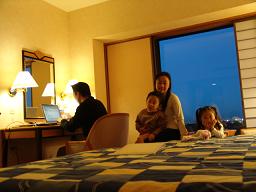 ホテルの部屋につくと・・・パパが仕事三昧・・・色々あるらしくて 「信長化 100%」です・・・おぉ 怖い。「パパ 写真写そう〜♪」 無視・・・ ま、これでも 家族写真よね♪
