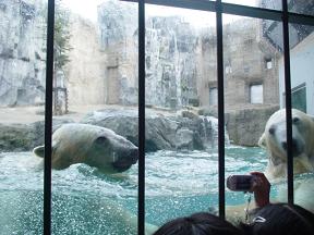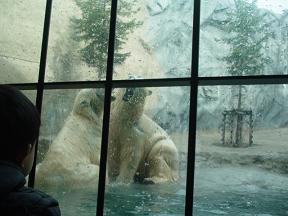 ↑ 白熊!!!! ガラス一枚向こうで 白熊の 陸での様子と 水中での様子を見る事ができます。 2頭の白熊が じゃれあって