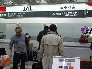 左:千歳空港です。 Jクラスの チェックインカウンター・・・差別化の為か 一応 花などが飾ってあり、並ぶ人も