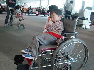 ↑ 左:搭乗口に行くと すでに 幸希に車椅子が待機していた・・・今回は「コウキ様」ではなくて 「H本さま」と呼ばれた。