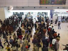 中: 連休前の すごい人xxx これ 搭乗手続きの為に並んでいるんですよ。しかもJAL一社に並んでいる・・・・