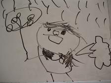 右:じいちゃんが 傘をさして 北海道を歩いている所。 右の くにゃくにゃっとしたのが 「北海道」ですって。