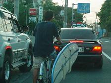 右:この人は 以前 茅ヶ崎市の辻堂という ポイント周辺で 見かけた 自転車サーファー。