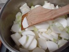 野菜は皮をむいて 薄切りにし 鍋にバターを入れて 色がつかないようにいためる。
