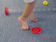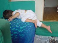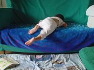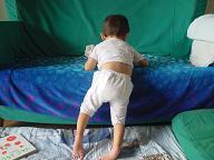 2月。待望のつかまり立ちを始めた。嬉しくて泣けた。体重の殆どをひじで支え、足は親指と人差し指で立ちかかとは浮いている、