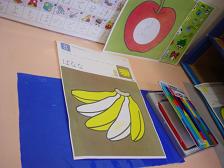 画像:午後は だいたい 幸希に合わせて何か 活動を考えてくれる。シールを貼ったり、パズルをしたり 平仮名を使ったり…今日は 「同じ色を塗りましょう♪」か?バナナとか 林檎の